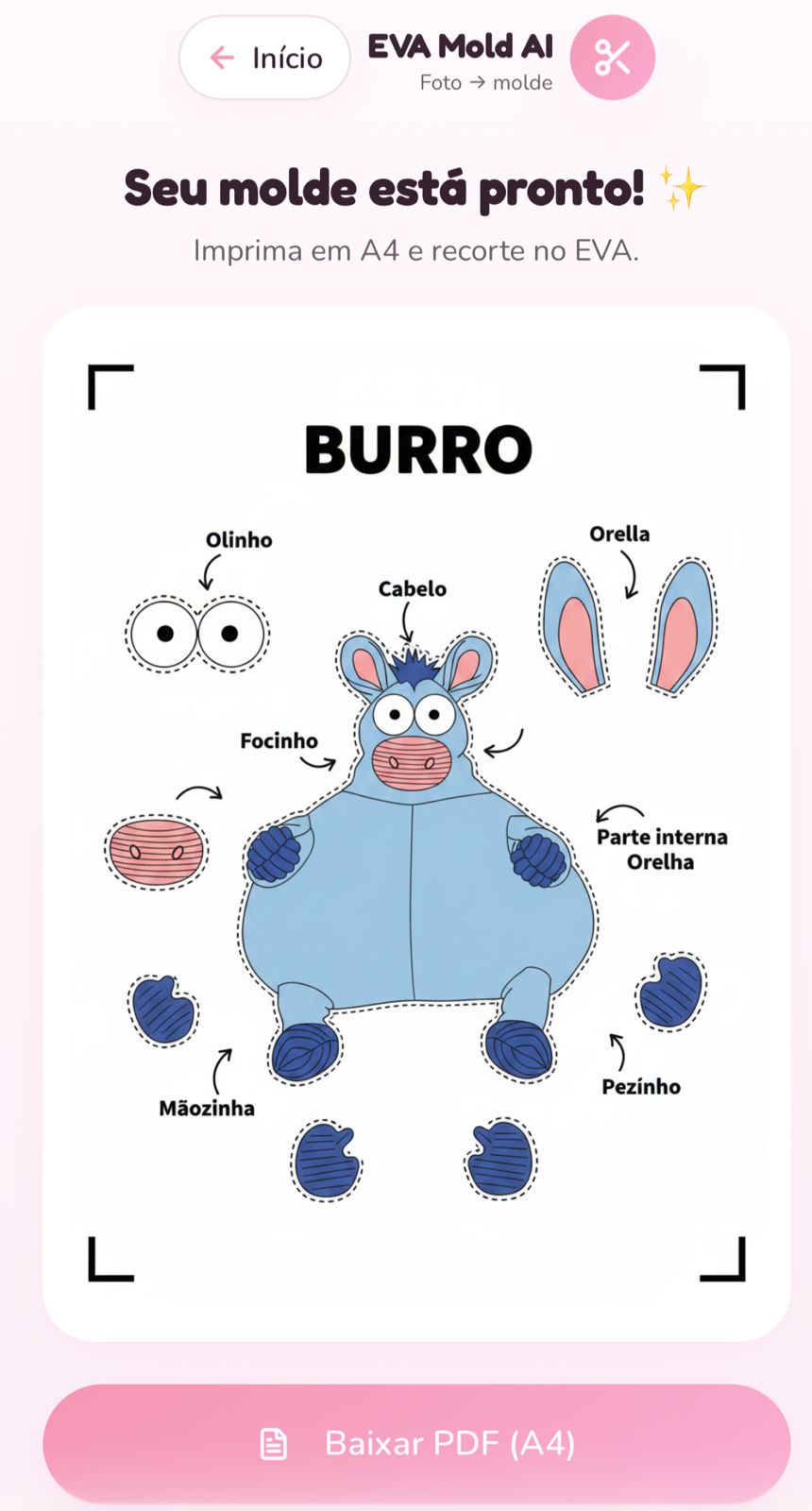 Cansada de caçar moldes na internet, tentar desenhar do zero ou se virar com algo "parecido"? Tire ou envie uma foto e a IA gera o molde exato que você quer — pronto para imprimir e recortar.